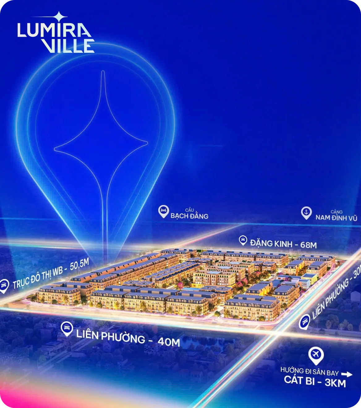 Lumira Ville là khu đô thị kiểu mẫu đẳng cấp được phát triển bởi Công ty CP Đầu tư H2H Việt Nam (thuộc tập đoàn Geleximco), tọa lạc tại vị trí chiến lược thuộc phường Đông Hải (Hải An cũ), TP. Hải Phòng – khu vực trung tâm phát triển năng động của thành phố cảng.